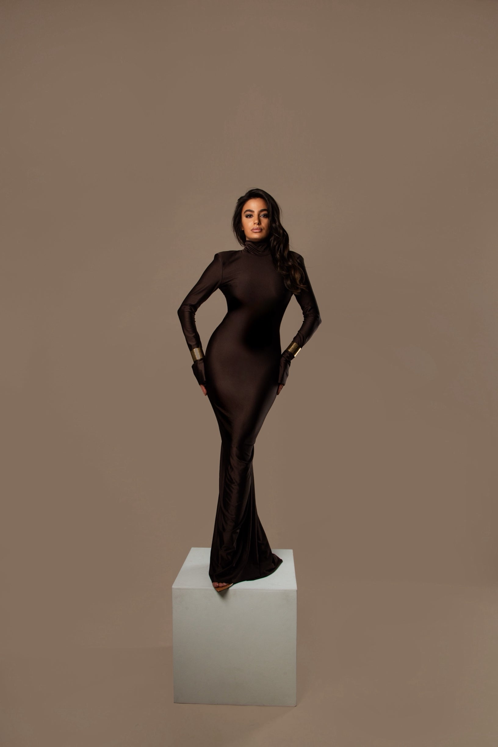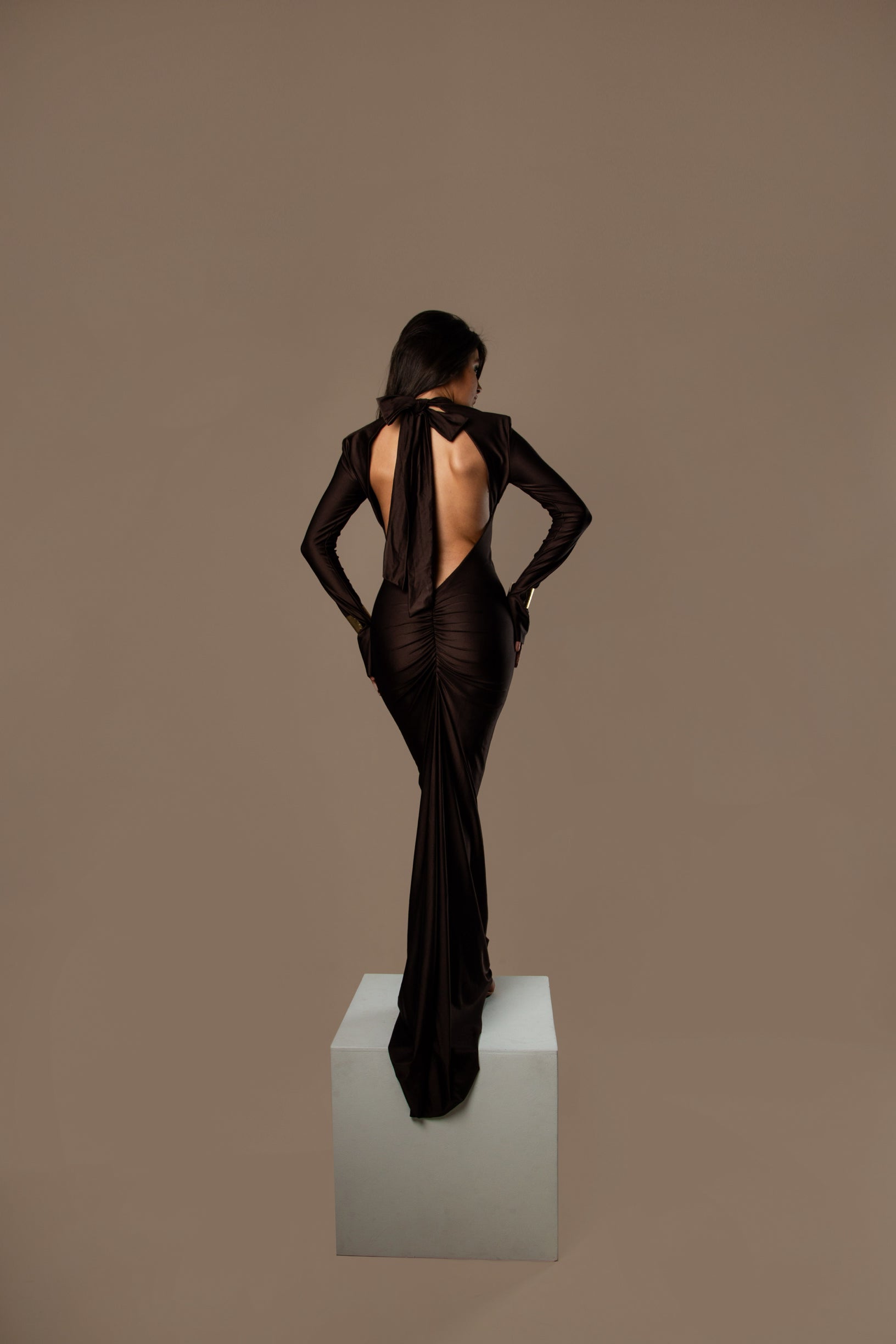 The long-sleeve maxi dress "AMARA" is made from soft Lycra that fits like a second skin, creating an elegant, feminine look. With its floor-length cut and alluring open back, it's perfect for special occasions.