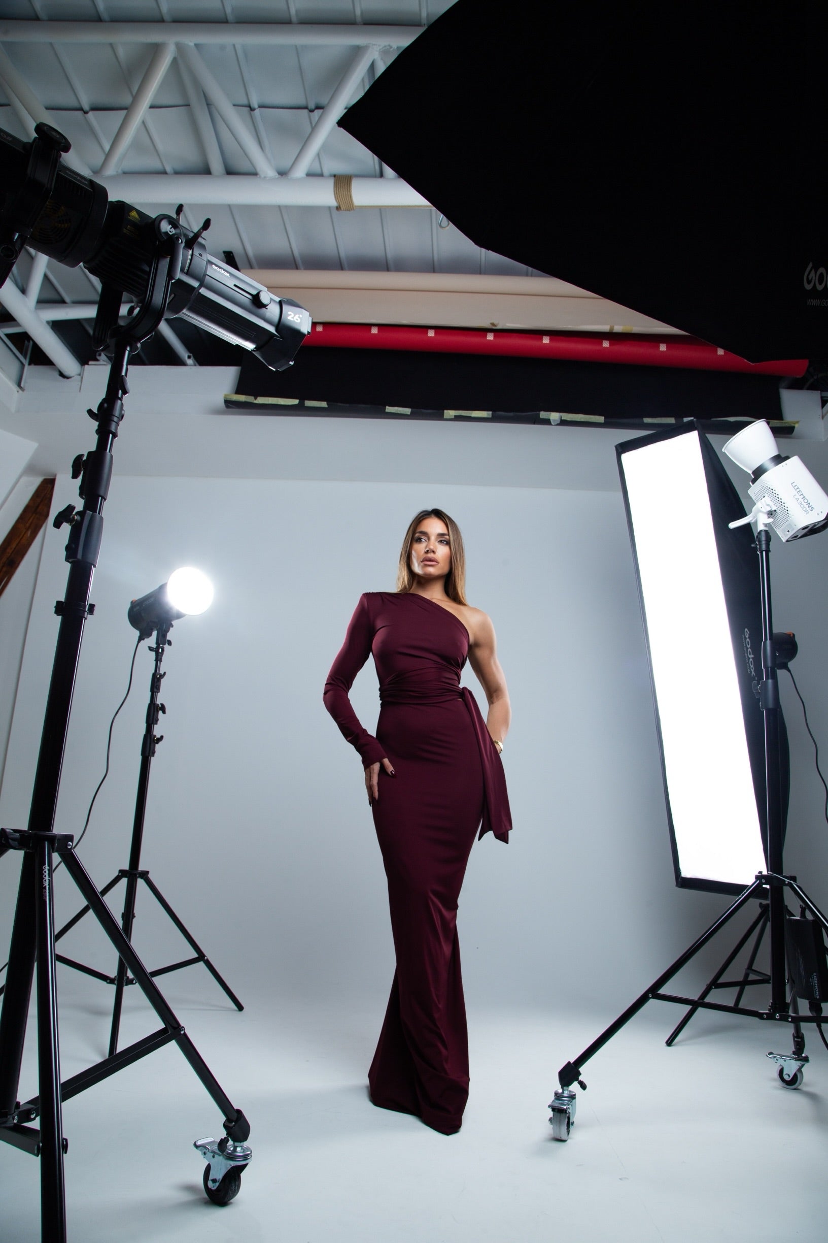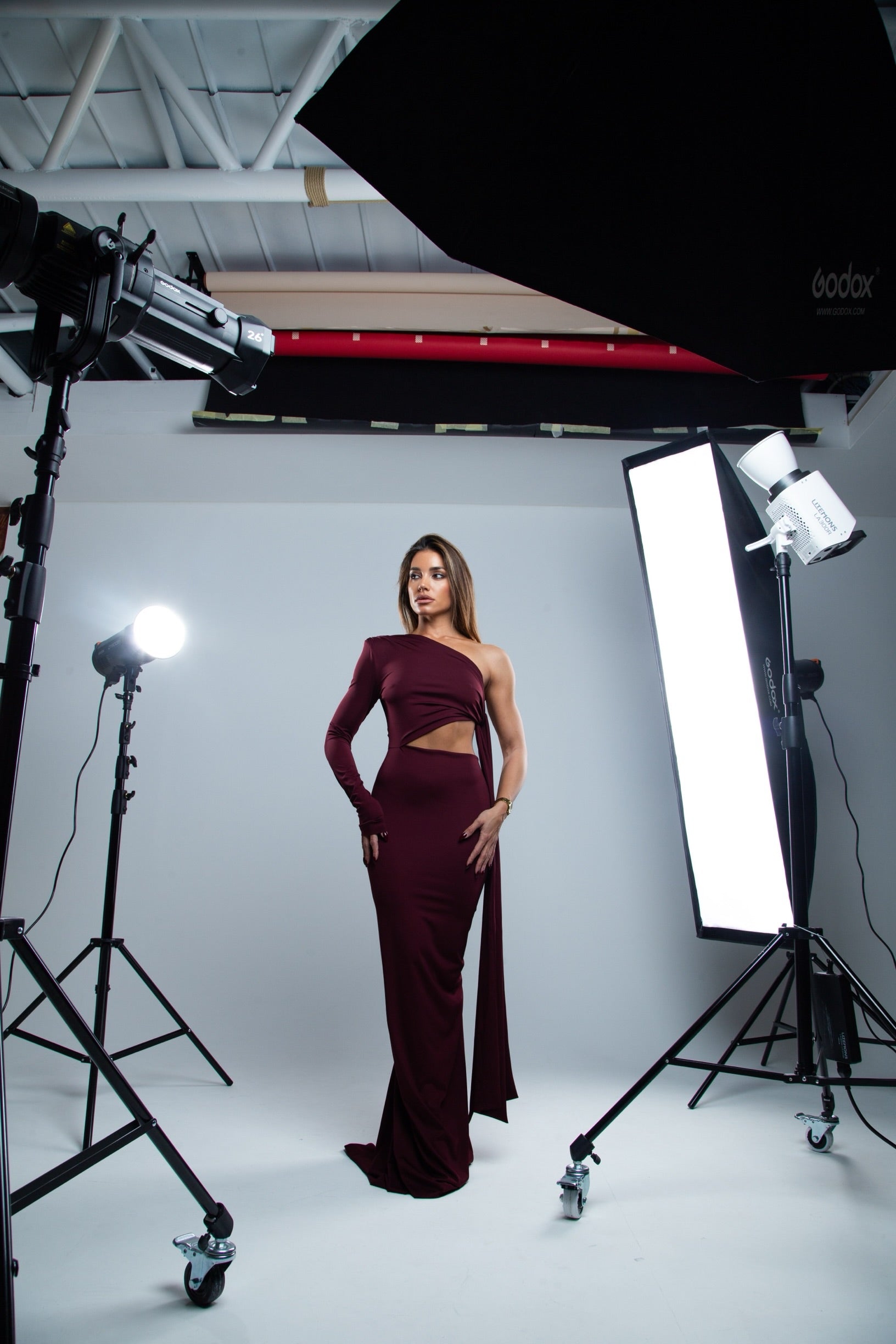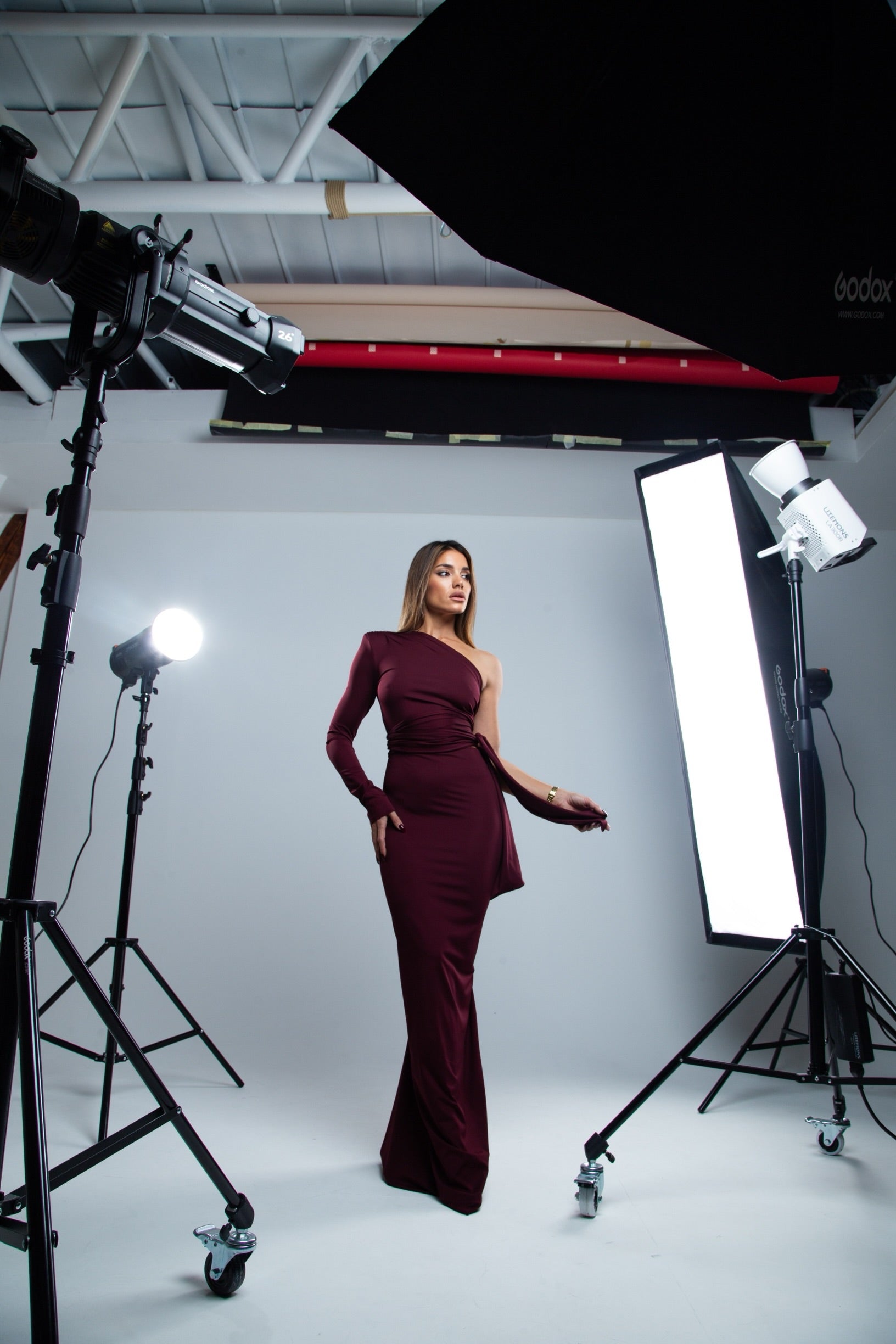 A long, elegant gown that stands out with its unique one-sleeve design. Sleek and form-fitting, it perfectly hugs the body's curves, giving an unmatched allure. Crafted from matte Lycra for ultimate comfort and a refined sheen.