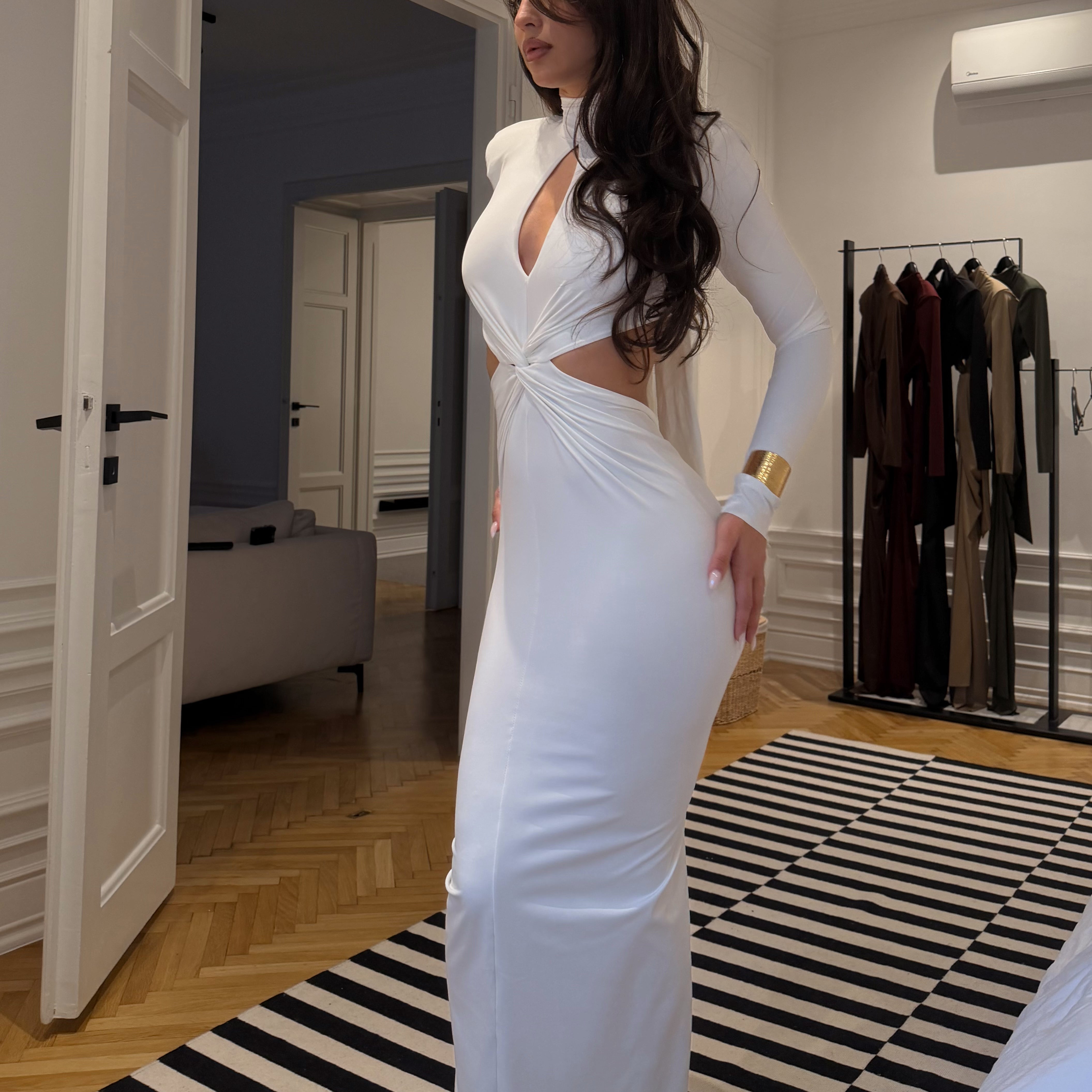Delicate cut-outs at the décolleté create subtle highlights, while the open-back design adds a sensual, modern touch. Structured shoulder pads define the silhouette and enhance confident posture, while the long sleeves bring balance and refined elegance to the overall look.
