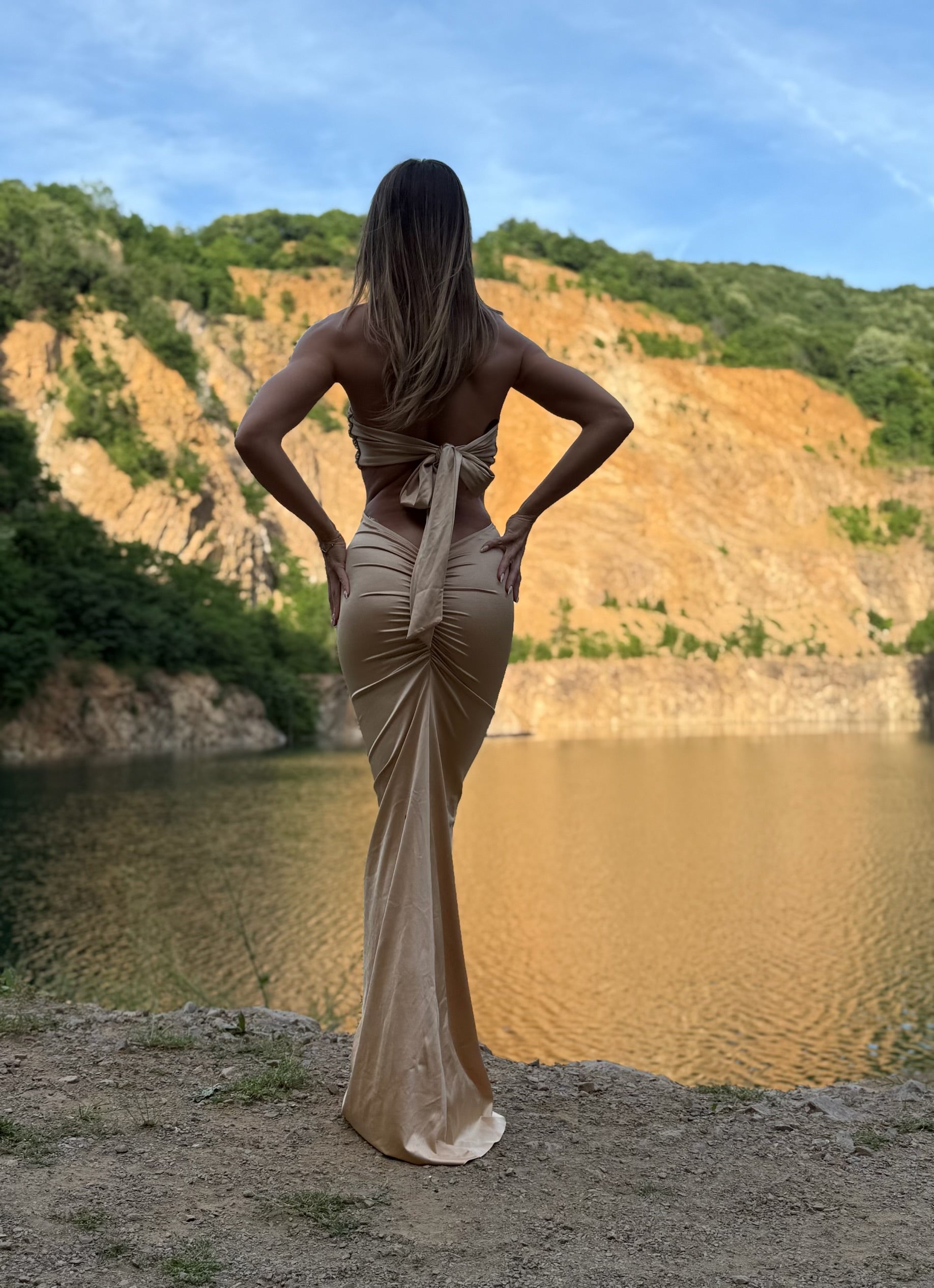 This dress, both sophisticated and subtly alluring, ensures you'll be the center of attention.