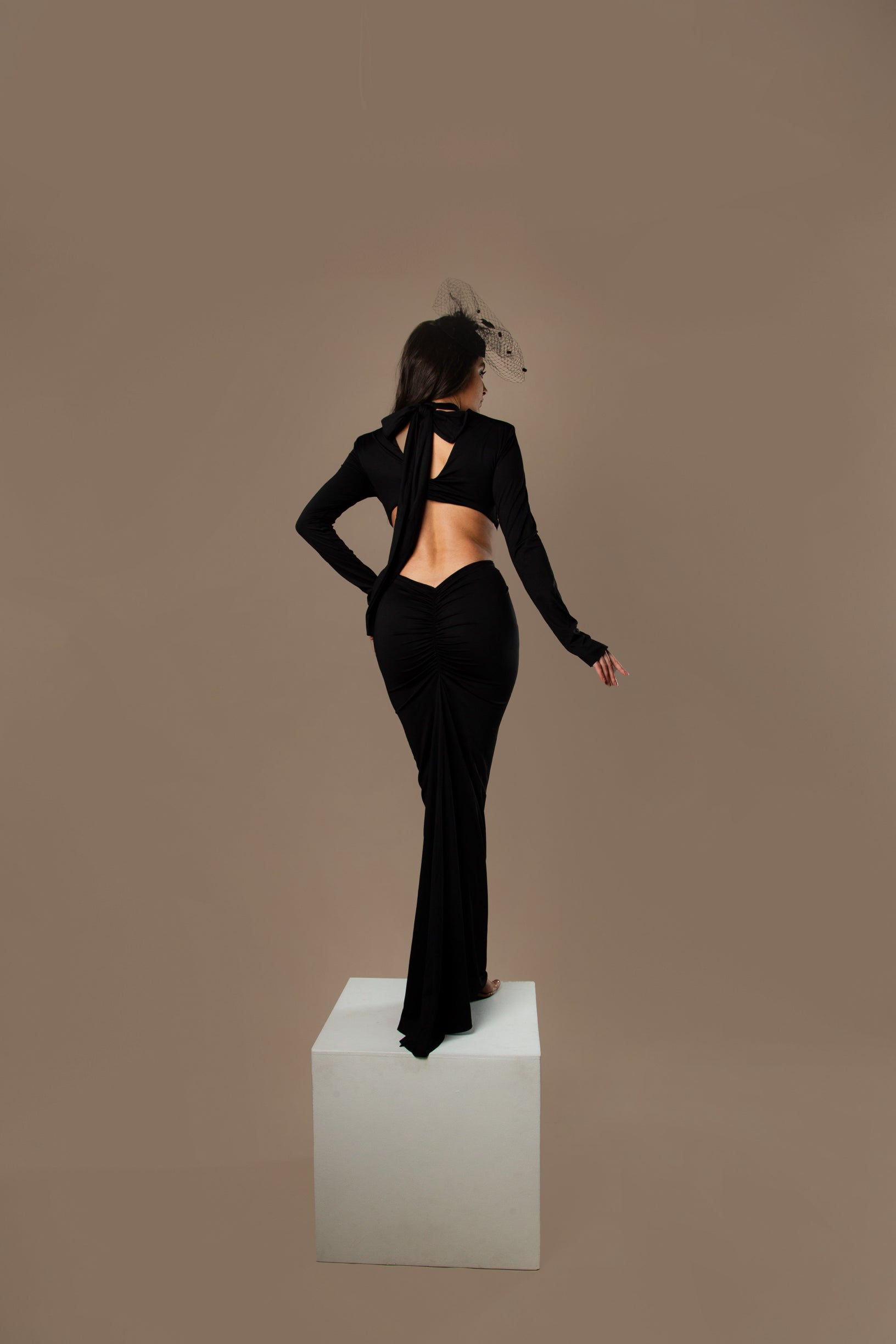 Delicate cut-outs at the décolleté create subtle highlights, while the open-back design adds a sensual, modern touch. Structured shoulder pads define the silhouette and enhance confident posture, while the long sleeves bring balance and refined elegance to the overall look.
